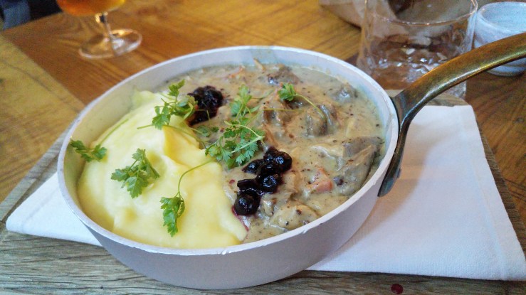 Home-like, raising a pleased smile dish – Venison stroganoff from Saaremaa with forest mushrooms and mashed potatoes. I got a sincere, big portion on a frying pan as if made it myself. Excellent meat, big pieces chopped. Dense sauce mixed up with onions and mushrooms. First sauce and meat seem too peppered, but in the end you understand that it’s not a sin to emphasize this venison with more pepper.