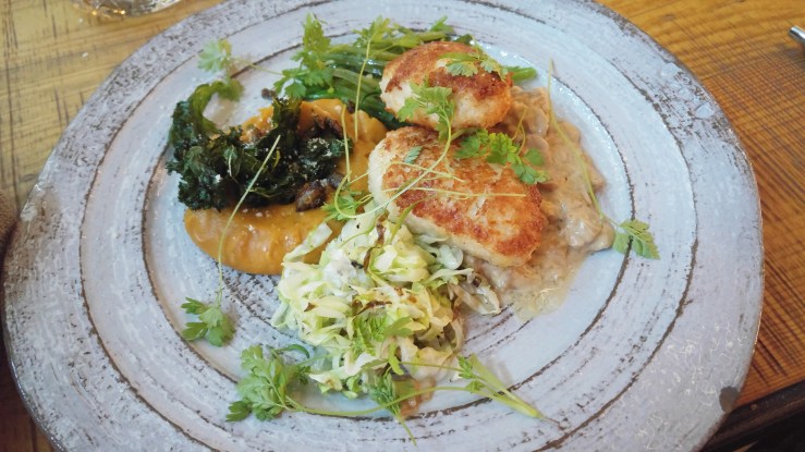 Беру нестандартное мясо для меня – Котлеты из кролика с тыквенным кремом и соусом из боровиков. Много составляющих, но, как ни странно, пюре с кале и обжаренными семечками стало фаворитом на тарелке. Котлеты… то ли кролик погиб зря, то ли пересолены, то ли добавлена некая сырная составляющая в них, лишняя определенно. Как будто ешь котлеты из горгонзолы. Трудно понять, невозможно забыть. На гарнир – жареная капуста, грибной соус – хорошо по отдельности, но вместе опять чувствуется излишняя соленость. Кажется ли только мне так?