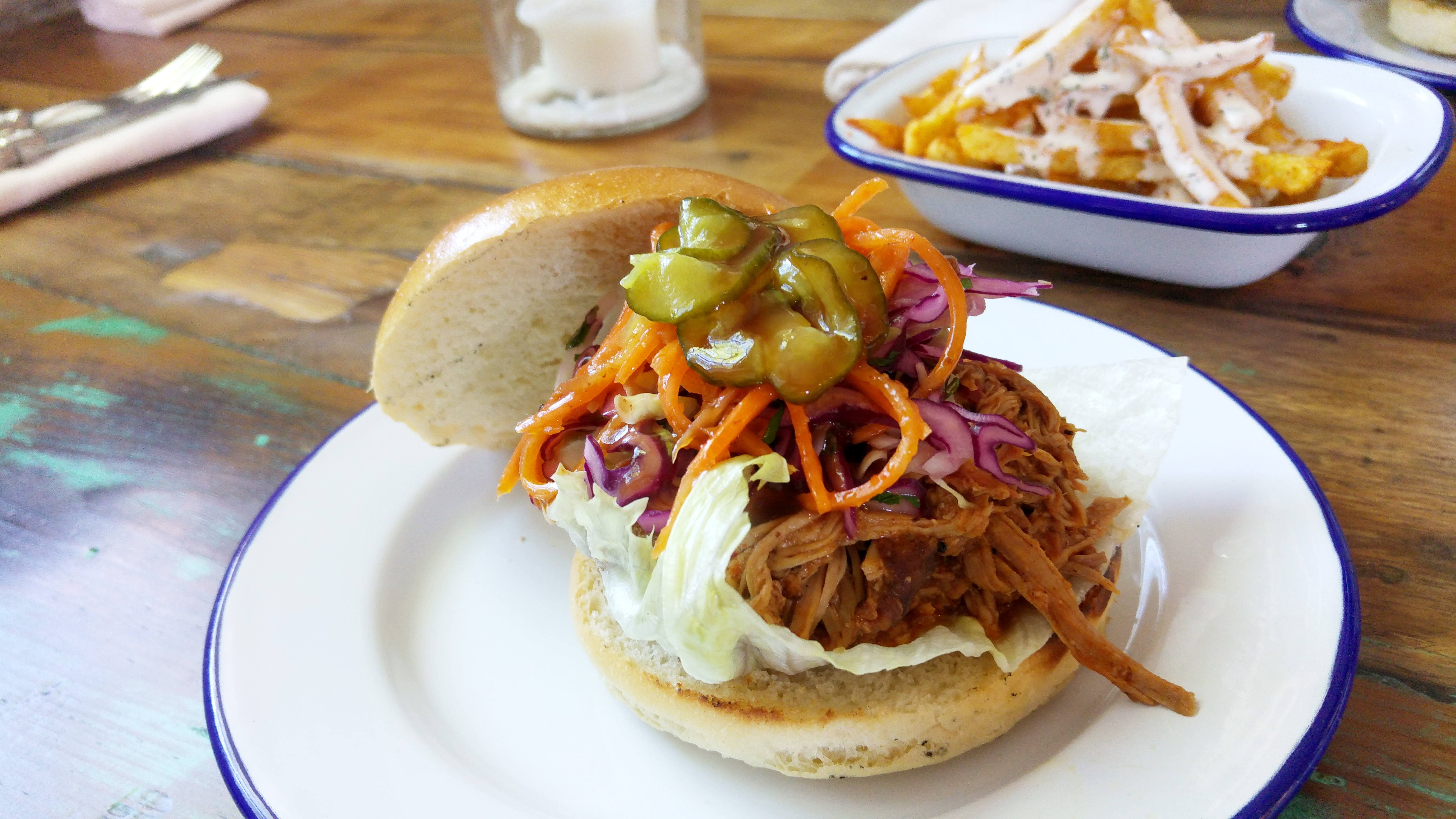 Pulled Pork bun, или бургер с рваной свининой. Соленость, острота в рваной свинине и ее идеальная мягкость. Зажаренная булочка, маринованный огурец, салат, морковь с уксусным оттенком и красная капуста – да, да и еще раз да. Есть следует ножом и вилкой, т.к. такой бургер разложен высокой башней вверх. Здесь соуса нет – сочность дает сок от свинины и моркови.