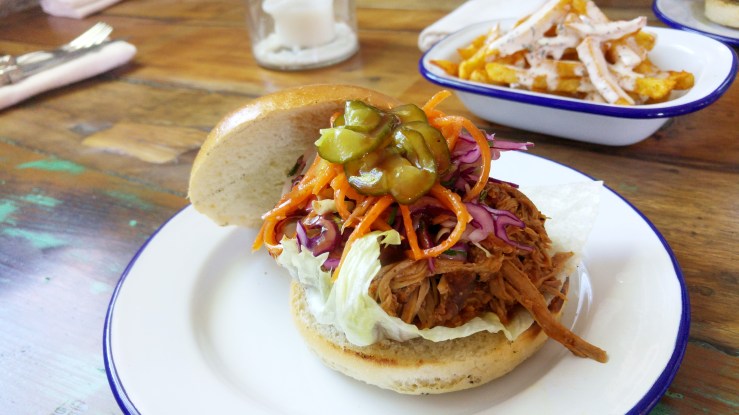 Pulled Pork bun, or burger with pulled pork. Salty, spicy pork and its ideal softness, oh boy – and here we are in heaven. Fried bun, pickled cucumber, salad, carrots with an acid note and red cabbage – yes, and once again Yes. You should eat with a knife and fork since such burger is spread out as high tower up. There is no sauce – all juiciness comes from pork and carrots.