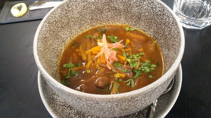 Duck heart – pak choi, carrot, teriyaki, chili. The dish was something between a soup and a stew. Rich spicy broth with complex taste. I advise to try it slowly and thoughtfully to catch chili and something similar to ginger. The crackling carrots, lots of hearts, dried fish skin for decor – good to eat now and whether turns cold, soup will be just excellent. I shall grumble a little: it was difficult to eat it from a narrow deep bowl.