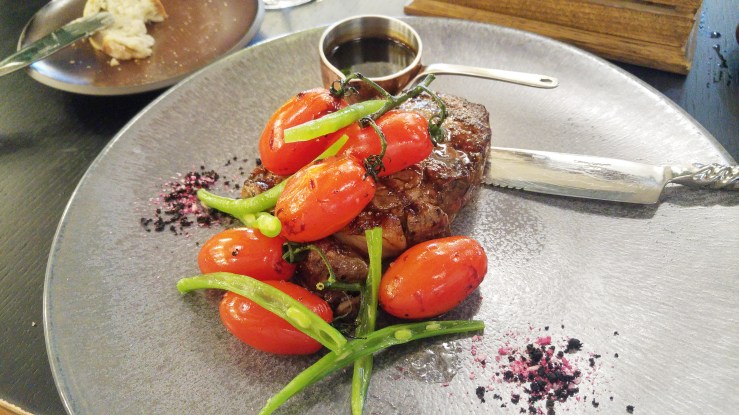 Мраморный стейк 250 гр – выдержанный говяжий стейк рибай, помидоры черри на ветке, мини-морковь. Благодаря обилию прожилок и жира съедается такой стейк быстро и легко, жевать то особо не приходится. Отличный соус к мясу и “мой размерчик”. На гарнир дополнительно взяла овощной coleslaw.