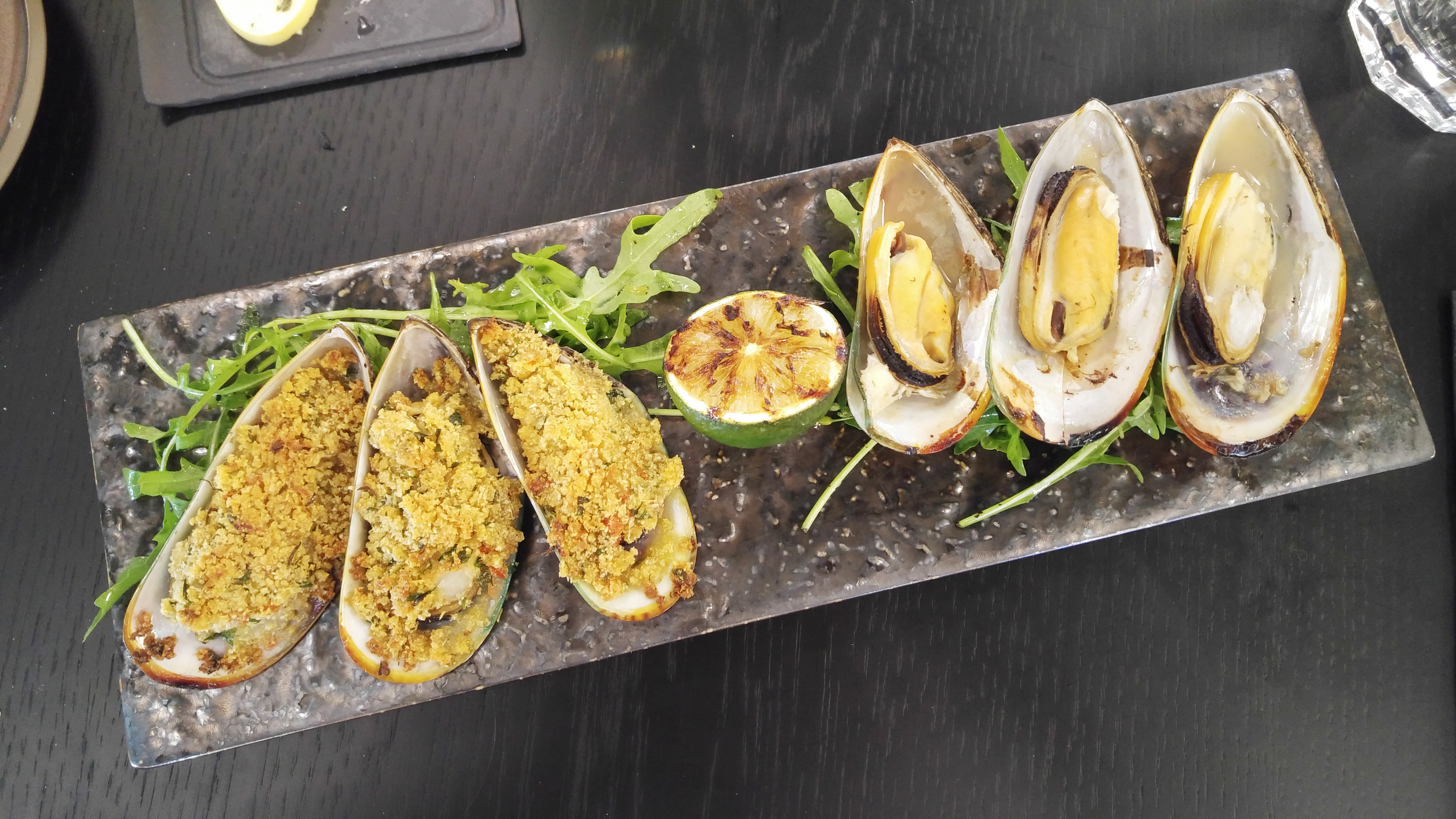 Зеленые мидии (green-lipped mussels) – фарофа, лайм. Незнакомые термины вызывают интерес. Так, например, запеченная начинка фарофа на основе муки и специй напоминала знакомые нам хлебные крошки. Не особо понравилось, так как слой толщиной в палец забивал вкус мидий. Половина порции была без присыпки, так что простой дуэт с лаймом пришелся по душе больше.
