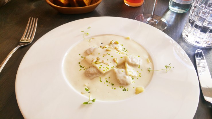 Равиоли из кролика – мусс из Горгонзолы, кедровые орехи. Я давний фанат этого сыра в любом его исполнении, поэтому сложно оставаться беспристрастным критиком. Мусс покорил меня с первой ложки. Можно подавать в виде отдельного сырного супа, и я б была уже счастлива. В тандеме с крольчатиной – сливочно, солено. К сведению, равиоли есть в меню с соусом из Пармезана.