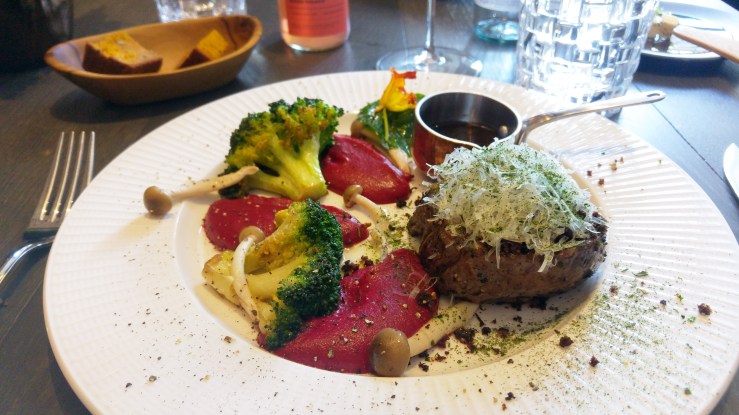 Аппетит разыгрался, но надолго голодной меня не оставили. С щекочущим нос запахом жареного прибыло основное блюдо – Говядина – свекольное пюре, соус из красного вина. Упругий брусок мяса был посыпан чем-то хрустящим, похожим на микс грибов и лука. Вку-сно! На гарнир сладкое пюре, шимеджи, брокколи – казалось бы, банально, а ничего лишнего. Просто идеальное мясо с винным соусом – за заявленную цену это подарок (19 евро при среднем чеке в 35 евро).