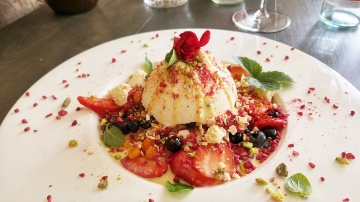 Шикарный десерт от заведения, который, к моему великому сожалению, убрали – Павлова а-ля ANNO – безе, замороженные взбитые сливки, свежие ягоды. При виде такого десерта невольно думаешь: есть жалко, настолько он был красив. Совершенно другой взгляд на классику – сливок в таком виде еще не ела. На самом деле, в замороженном виде они казались ванильным мороженым. Помню эту россыпь сладчайших ягод, фисташек в соусе …ах, верните Павлову в меню!